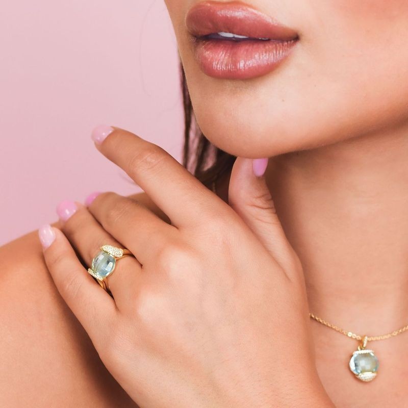 Anello placcato oro giallo con cristallo color acquamarina racchiuso in un doppio pavè di zirconi naturali. L'articolo verrà spedito in confezione originale BOCCADAMO.