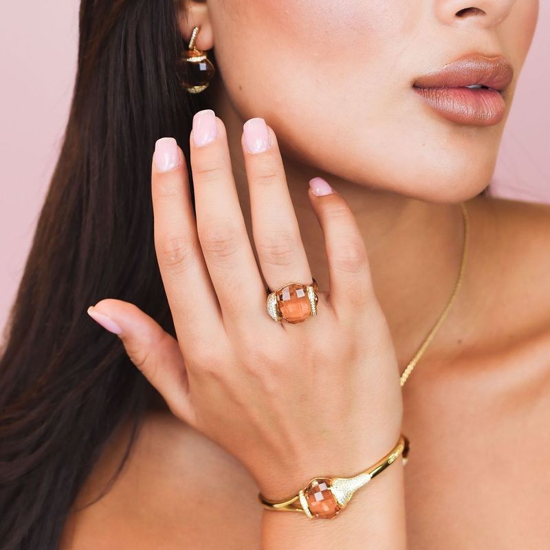 Anello placcato oro giallo con cristallo color peach mm 14 racchiuso in un doppio pavè di zirconi naturali. L'articolo verrà spedito in confezione originale BOCCADAMO.