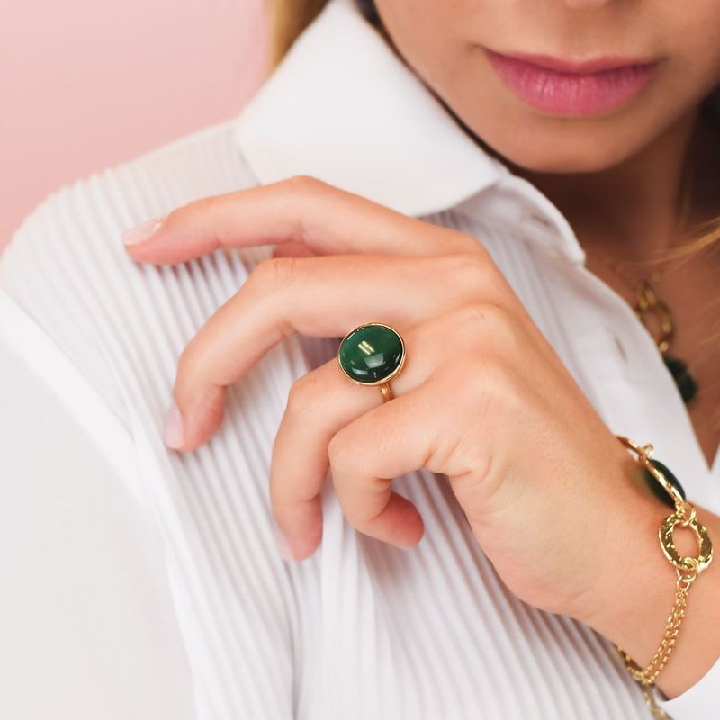 Anello placcato oro giallo con cristallo effetto cabochon color verde scuro. Collezione BOCCADAMO. L'articolo verrà spedito in confezione originale BOCCADAMO.