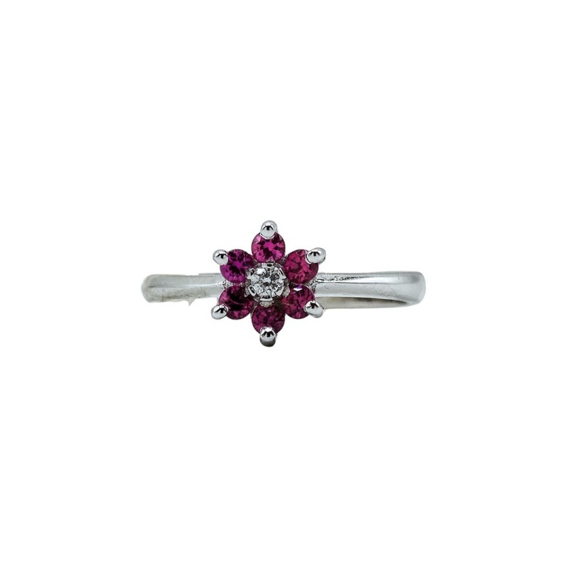 Anello fiore in oro 18kt con rubini naturali 0,24 ct. e diamanti taglio brillante G VS da 0,04 ct. Un anello semplice ma d’effetto, pensato per accompagnarti ogni giorno. L'articolo verrà spedito in confezione originale.
