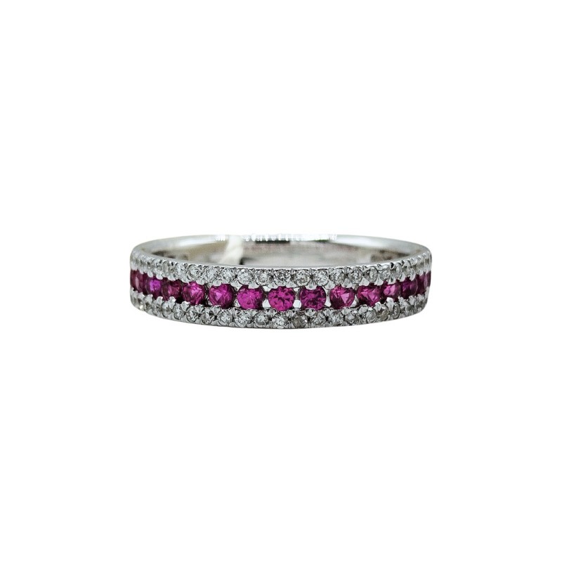 Anello riviera in oro 18kt con rubini naturali 0,46 ct. e diamanti taglio brillante G VS 0,39 ct. Linee morbide e pulite per un anello che si adatta a qualsiasi stile. L'articolo verrà spedito in confezione originale.
