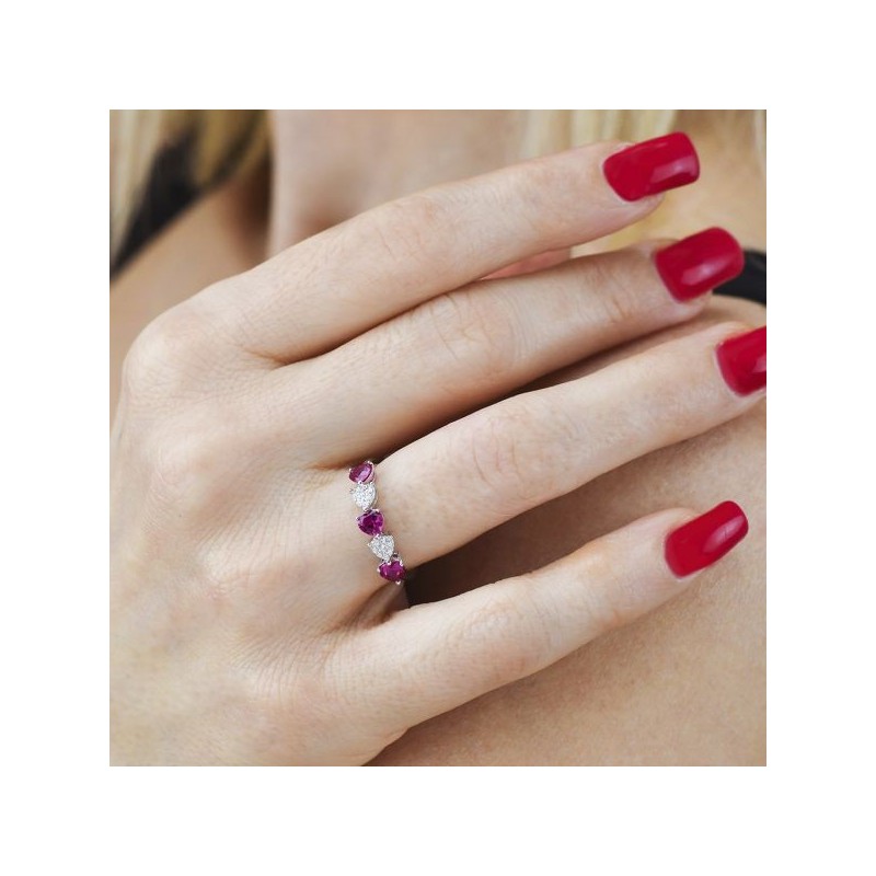 Anello da Donna di Boccadamo della collezione Sophie della linea Jewels. Anello in argento rodiato con zirconi centrali a forma di cuore, di colore rubino alternati a cuori di zirconi di colore bianco.. Materiale: argento . Produzione: realizzato in Italia. Misura: regolabile dalla 13 alla 17. Dimensione: centrale cm 2Questo anello verrà spedito con Scatola Originale Boccadamo.