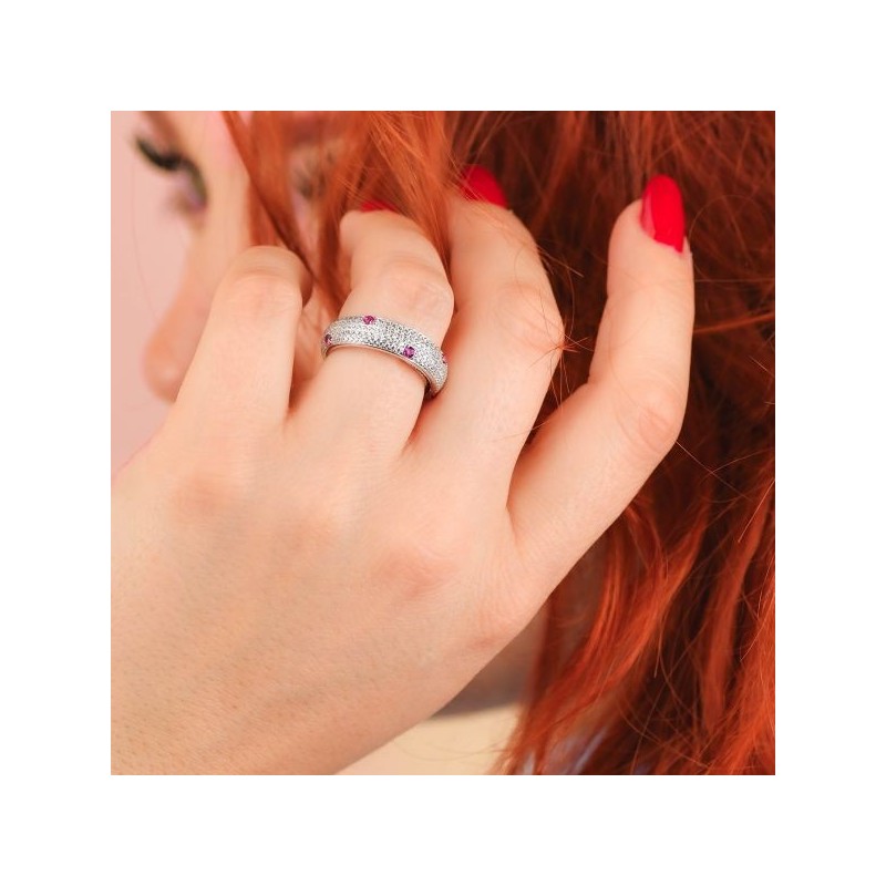 Anello di Boccadamo da donna della linea Jewels e della collezione Sophie. Anello grande in argento con fascia interna regolabile e centrale di pavè di zirconi di colore bianco e rubino. Misura: regolabile dalla 15 alla 19. Questo anello verrà spedito con Scatola Originale Boccadamo.