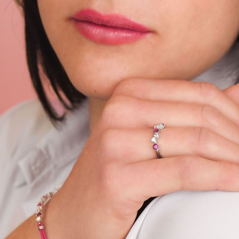 Anello contrarié in argento 925 rodiato con centrale di zirconi naturali color rubino. Linea BOCADAMO. L'articolo verrà spedito in confezione originale BOCCADAMO.