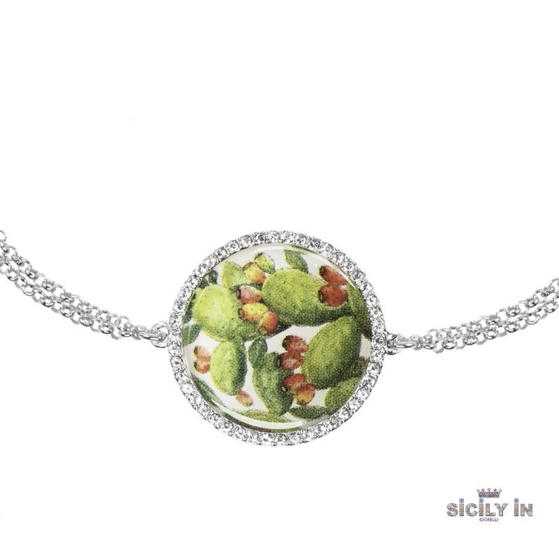 Bracciale Sicily In Donna è realizzato a doppio filo in metallo è caratterizzata con due pendenti, uno con motivo fantasia, i fico d'india, più un secondo pendente sovrapposto al primo costituito da un cerchio contornato da zirconi bianchi. La lunghezza è regolabile, chiusura con moschettone.Questo articolo verrà spedito con scatola originale Mizzica.