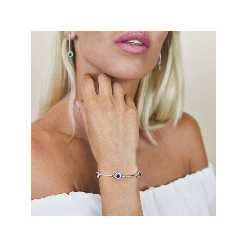 Bracciale rodiato con cristalli centrali d colore rossi, blu, verdi e inseriti in rigidi zirconi bianchi.Il bracciale è realizzato in Italia, il materiale è argento, la misura della sua lunghezza è di 16cm estendibile fino a 19,5cm, con chiusura a moschettone. I gioielli Boccadamo grazie al suo design raffinato ed elegante sono creazioni dall'indiscutibile fascino italiano. Collezione SOPHIE.Questo articolo verrà spedito con scatola originale Boccadamo.