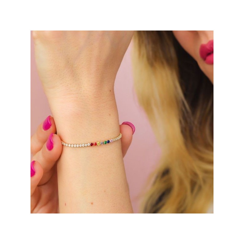 Bracciale di Boccadamo da donna della linea Jewels e della collezione Sophie. Bracciale in argento modello tennis con centrale di zirconi di colore rosa, zaffiro, tanzanite, verde, giallo, orange e rubino. Misura: lunghezza cm 17 estendibile fino a cm 20. Questo bracciale verrà spedito con Scatola Originale Boccadamo.