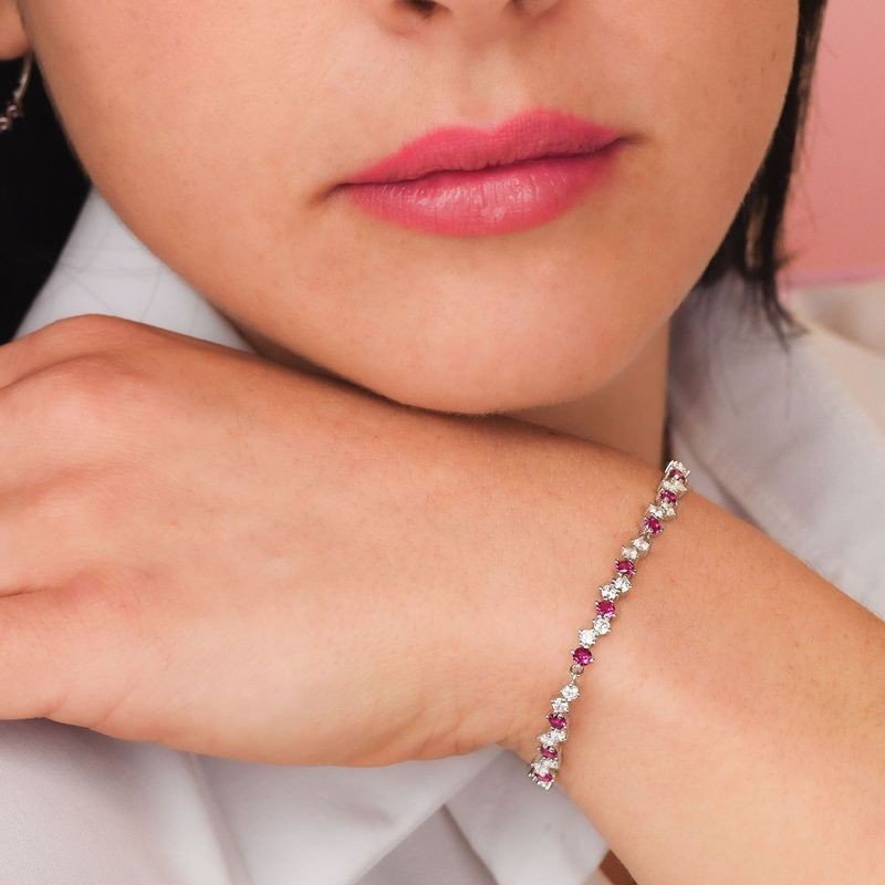 Bracciale rigido in argento 925 con cinque moduli di zirconi naturali a baguette di colore bianco e rubino. L'articolo verrà spedito in confezione originale BOCCADAMO.