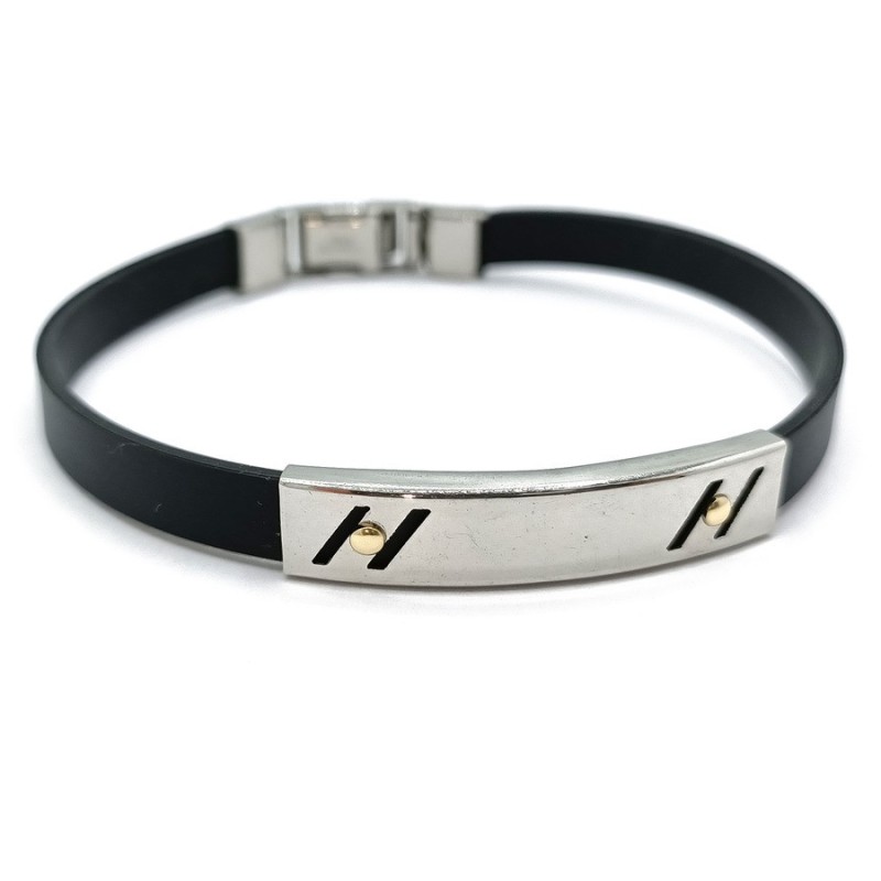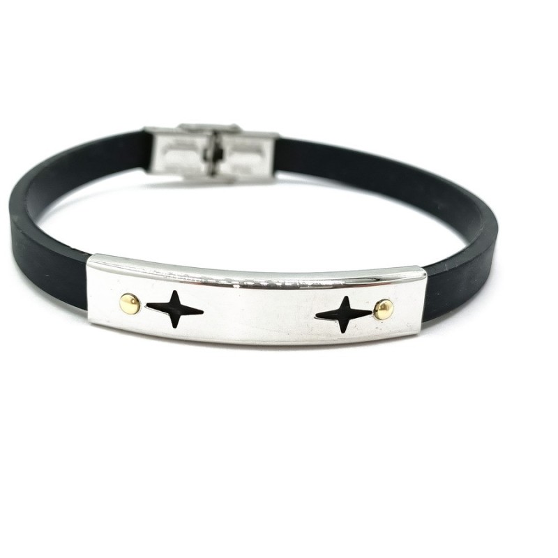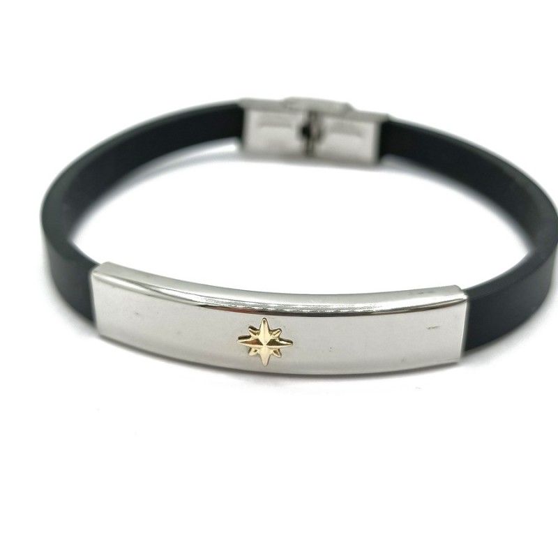 bracciale uomo in caucciù nero e piastra in acciaio 316l con vari intagli diversi e dettagli dorati .