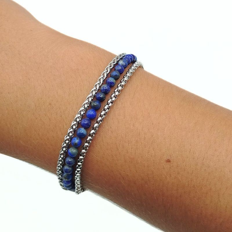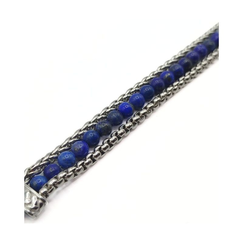 Bracciale in acciaio tre fili con palline colorazione blu e chiusura moschettone. Questo articolo verrà spedito con scatola X LUI.