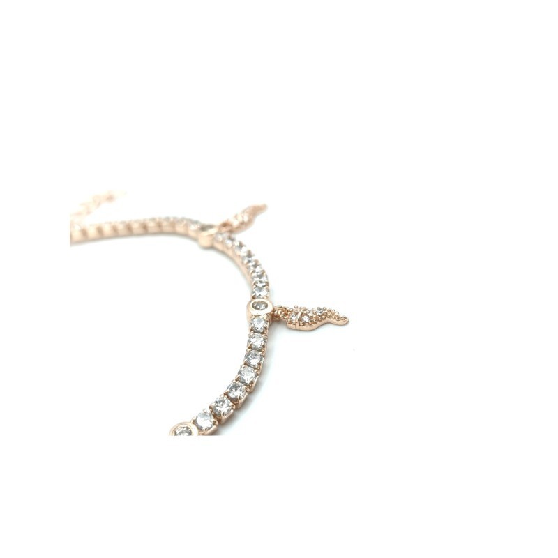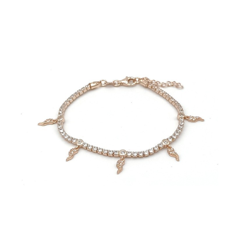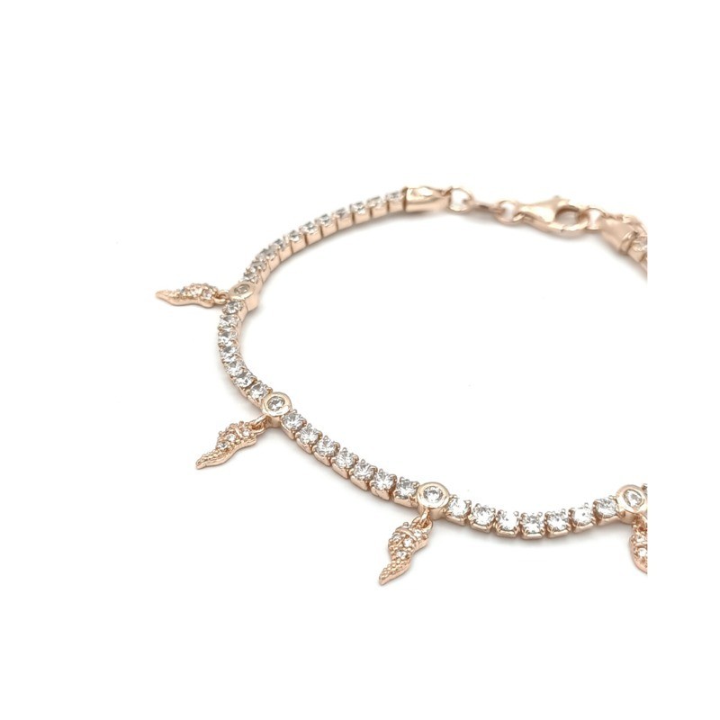 Bracciale Tennis in Argento 925°° con zirconi bianchi naturali e pendenti con corno. Disponibile nella variante rosata e dorata. Questo articolo verrà spedito con il suo astuccio.