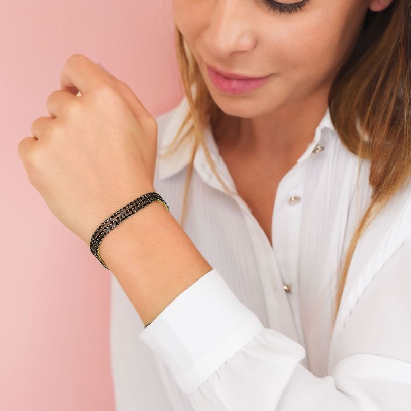 Bracciale in acciaio placcato oro giallo composto da tre fili di zirconi di colore nero. L'articolo verrà spedito in confezione originale BOCCADAMO.