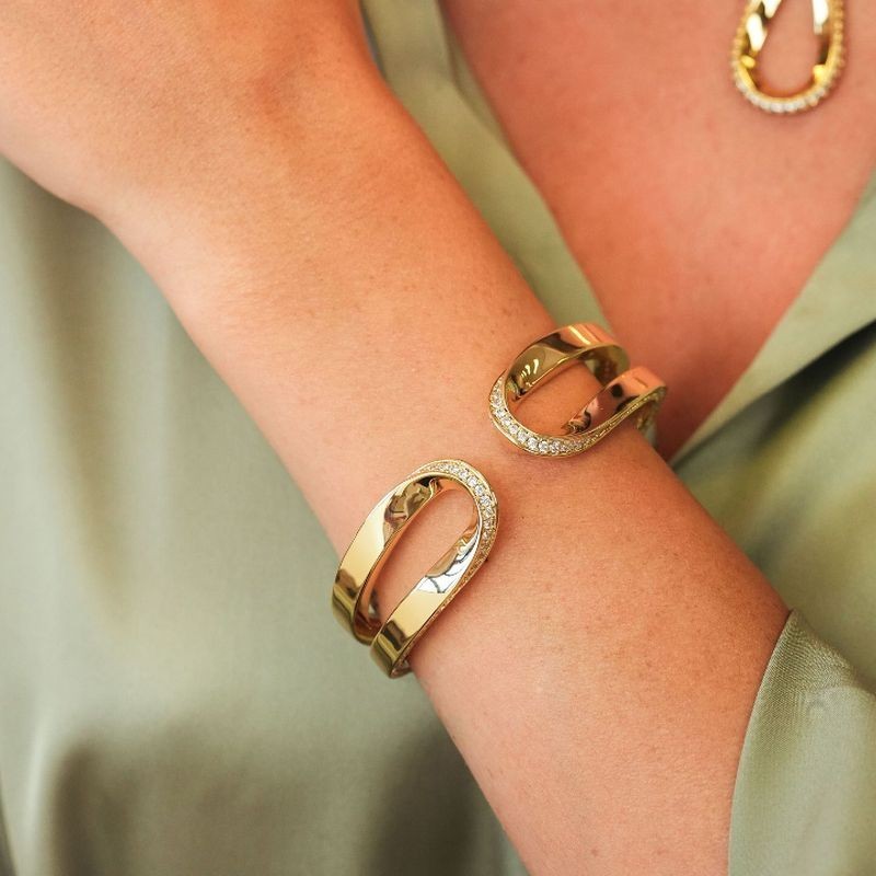 Bracciale placcato oro giallo rigido a fascia doppia con file di zirconi naturali incastonati. L'articolo verrà spedito in confezione originale BOCCADAMO.