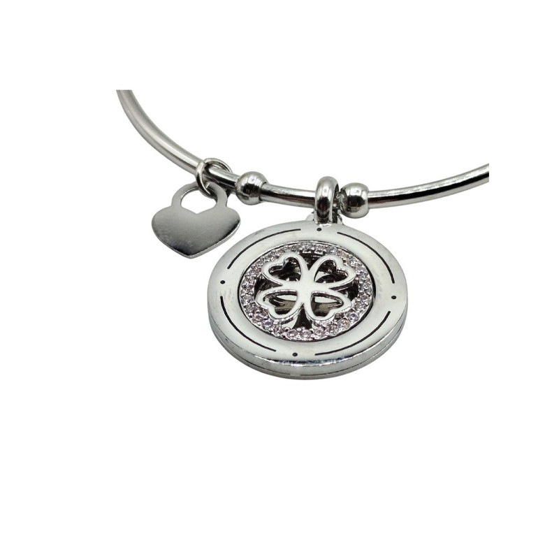 Bracciale da donna in acciao modello manetta con quadrifoglio e cuore. L'articolo verrà spedito in confezione originale IL GIOIELLO DI PANI.