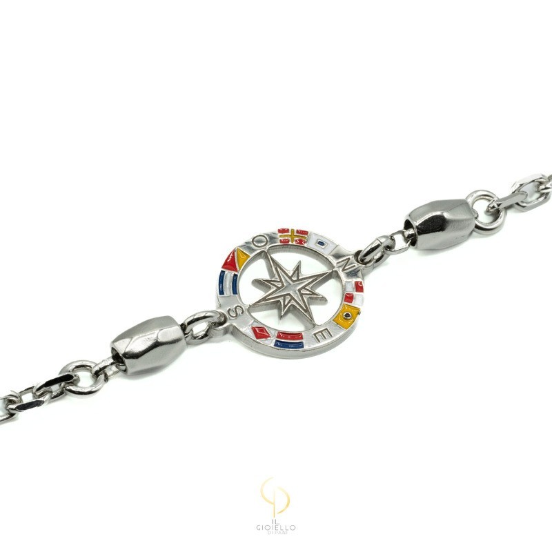 Bracciale in Argento 925/°°° con rosa dei venti e bandierine - Questo articolo fa parte della linea Per Lui e verrà spedito col suo particolare astuccio.