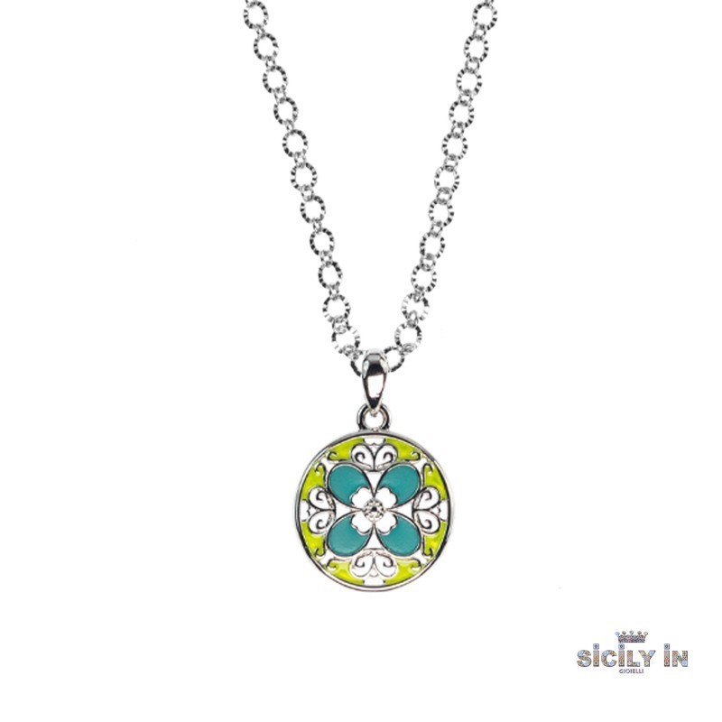 Collana 'Sicily In', con cinque charm, è ideata e realizzata da Sicily In. La collana è impreziosia da un quadrifoglio colorato dai verde chiaro e azzurro. La lunghezza è regolabile grazie alla sua chiusura a moschettone. Composta esclusivamente da metallo anallergico.Questo articolo verrà spedito con scatola originale Mizzica.