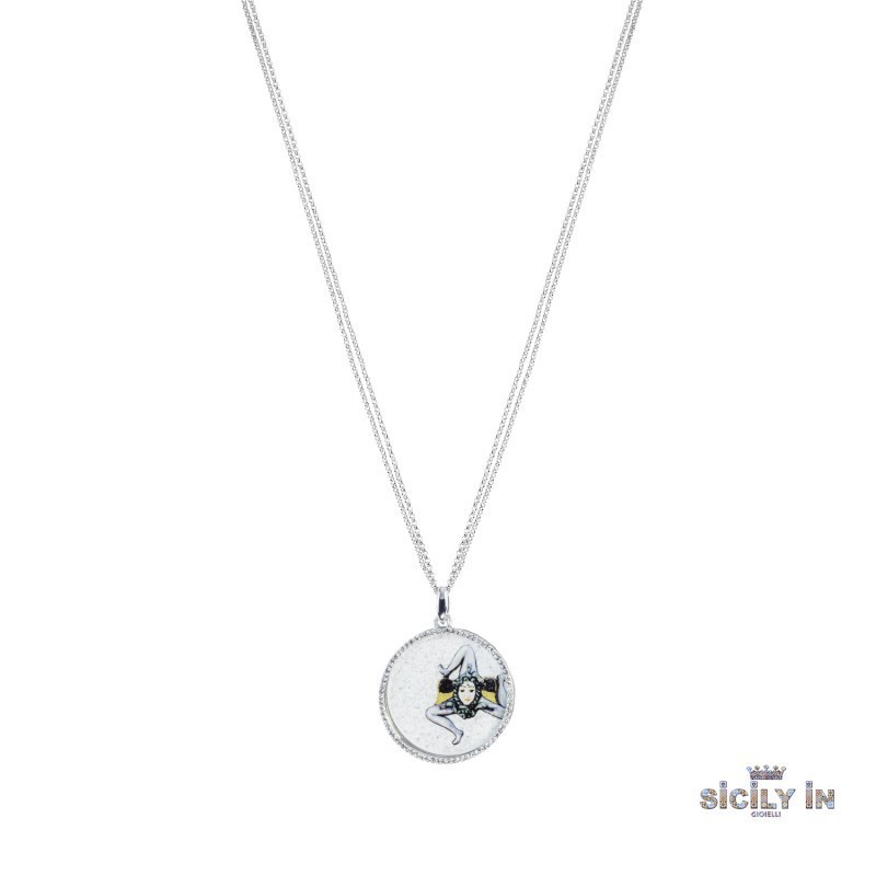 Collana Sicily In Donna è realizzata a doppio filo in metallo è caratterizzata con due pendenti, uno con motivo fantasia, la trinacria, più un secondo pendente sovrapposto al primo costituito da un cerchio contornato da zirconi bianchi. La lunghezza catena cm 80+7 e chiusura con moschettone.Questo articolo verrà spedito con scatola originale Mizzica.