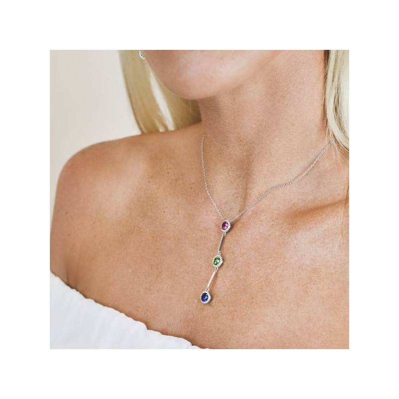 Collana rodiata con tre zirconi pendenti rubino, verde e blu, circondati da zirconi, alternati a file di zirconi bianchi. La collana è realizzata in Italia, il materiale è argento, la misura della sua lunghezza è di 39cm estendibile fino a 45cm, con chiusura a moschettone. I gioielli Boccadamo grazie al suo design raffinato ed elegante sono creazioni dall'indiscutibile fascino italiano. Collezione SOPHIE.Questo articolo verrà spedito con scatola originale Boccadamo.