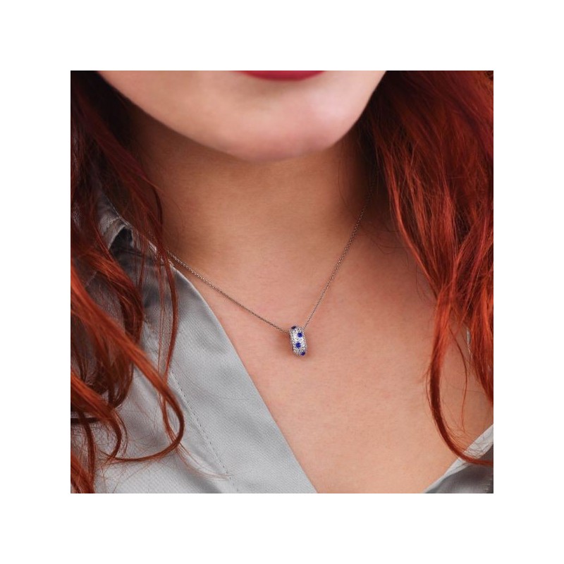 Collana di Boccadamo da donna della linea Jewels e della collezione Sophie. Collana in argento con anello ovale di pavè di zirconi di colore bianco e blu. Misura: lunghezza cm 38 estendibile fino a cm 43,5 e dimensione: pendente cm 1,2x8; spessore pavè mm 8. Questo collana verrà spedito con Scatola Originale Boccadamo.