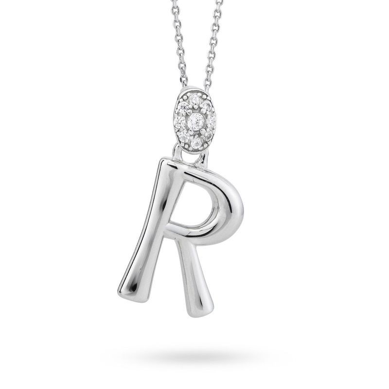 Collana in argento, stile girocollo, con pendente a forma di lettera R e perno in zirconia. L'articolo verrà spedito in confezione originale.