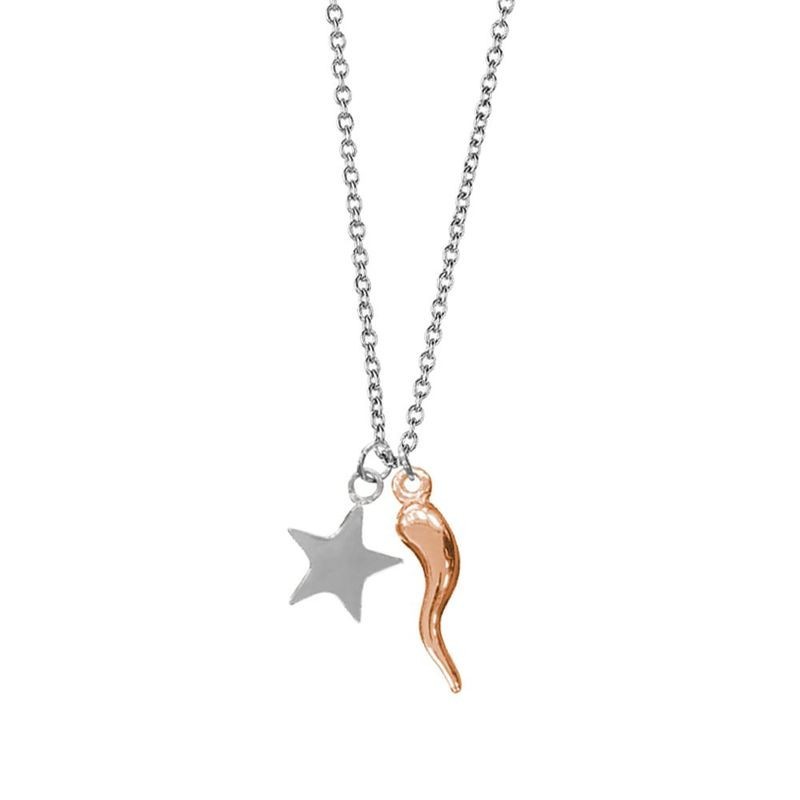 Collana in acciaio rodiato con ciondolo portafortuna in ottone placcato oro rosa e stella in acciaio rodiato. Lunghezza 38 cm, estensibile fino a 43,5 cm. L'articolo verrà spedito in confezione originale BOCCADAMO.