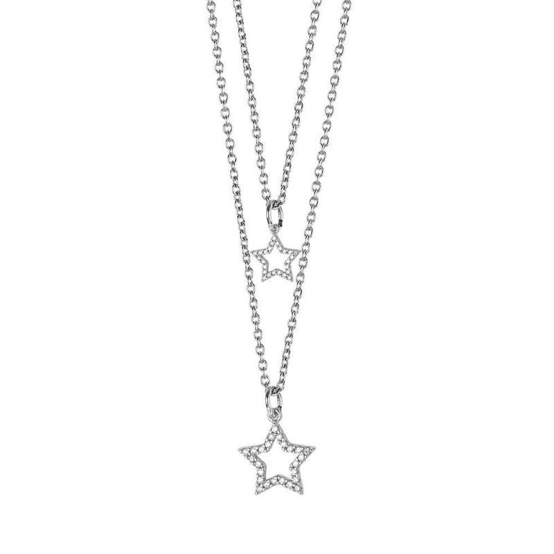 Collana in acciaio inox rodiato a doppio filo degradato con stelle in bronzo rodiato con profili in zircone. L'articolo verrà spedito in confezione originale.