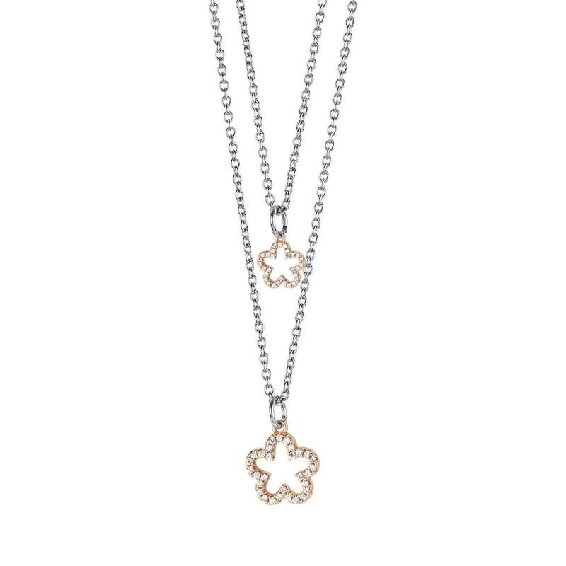 Collana in acciaio rodiato degradé a doppio filo con fiori pendenti in bronzo placcato oro rosa con profilo in zirconi. Lunghezza filo più corto 38 cm; lunghezza filo più lungo 43 cm e allungamento di 5,5 cm.L'articolo verrà spedito in confezione originale.