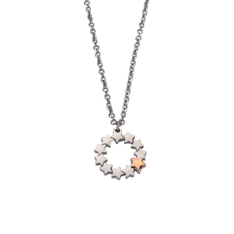 Collana rodiata con pendente circolare composto da stelle e stella in rilievo placcata oro rosa. L'articolo verrà spedito in confezione originale BOCCADAMO.