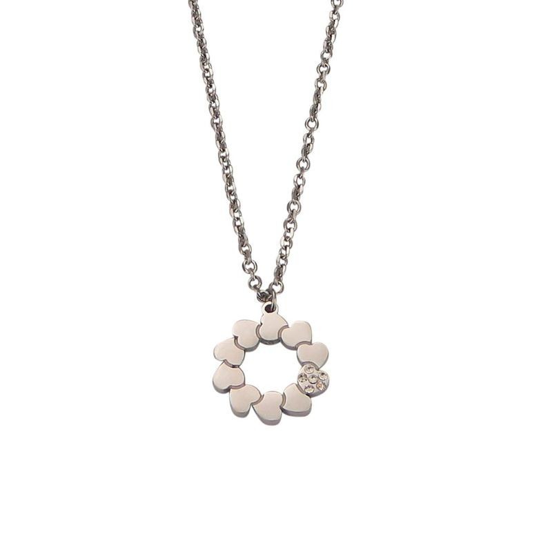 Collana rodiata con pendente circolare composto da cuori e cuore di strass in rilievo. L'articolo verrà spedito in confezione originale BOCCADAMO.