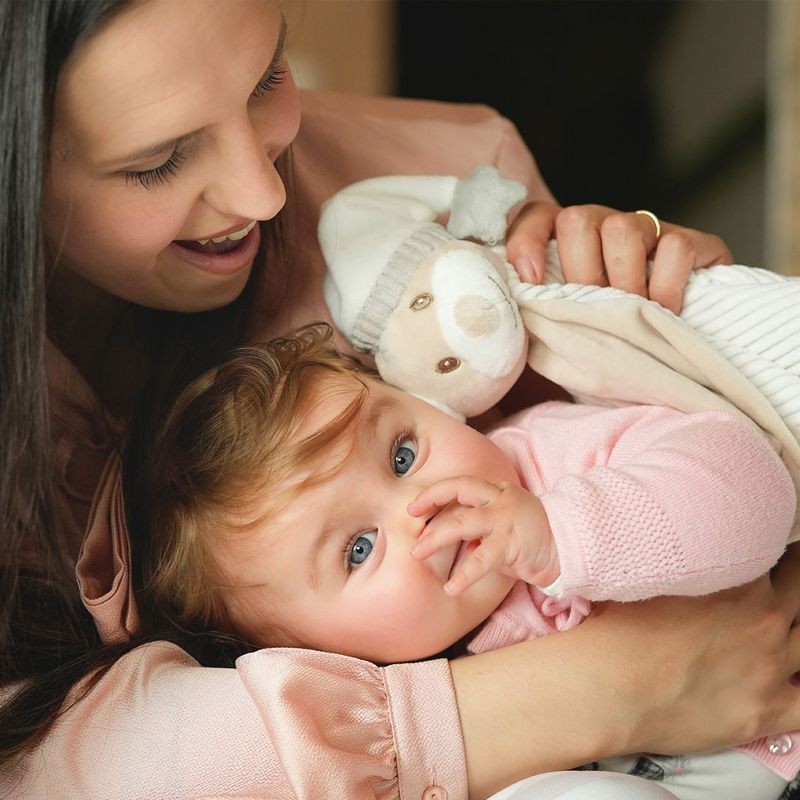 Collana con ciondolo sonoro e coppetta con stelle di pavè di zirconi. La collana per la neomamma è inserita all'interno di una confezione dedicata che contiene anche un tenero peluche-copertina per il neonato.