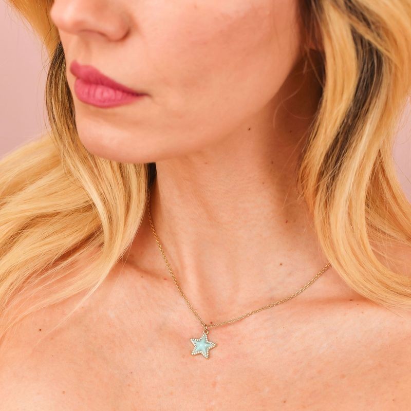 Collana in acciaio placcata oro giallo con ciondolo pendente in bronzo placcato, a forma di stella, circondato da zirconi e smaltato nel colore acquamarina. L'articolo verrà spedito in confezione originale BOCCADAMO.