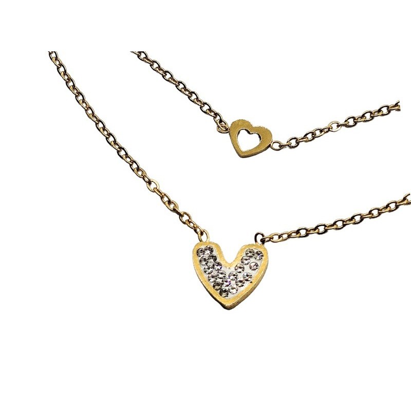 Collana doppio filo da donna in acciaio dorato con cuori e zirconi bianchi. Chiusura con moschettone. L'articolo verrà spedito in confezione originale IL GIOIELLO DI PANI.