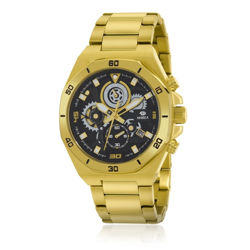 Orologio da polso analogico Marea, Precisione giapponese movimento a 3 lancette gerantendo una misurazione precisa del tempo in ogni momento.Stile sportivo distintivo: quadrante nero con dettagli dorati che fonde eleganza e dinamismo in un design moderno e sportivo.Costruzione durevole la cassa in metallo e il bracciale in acciaio dorato offrono resistenza e durata, mantenendo il suo fascino nel tempo.