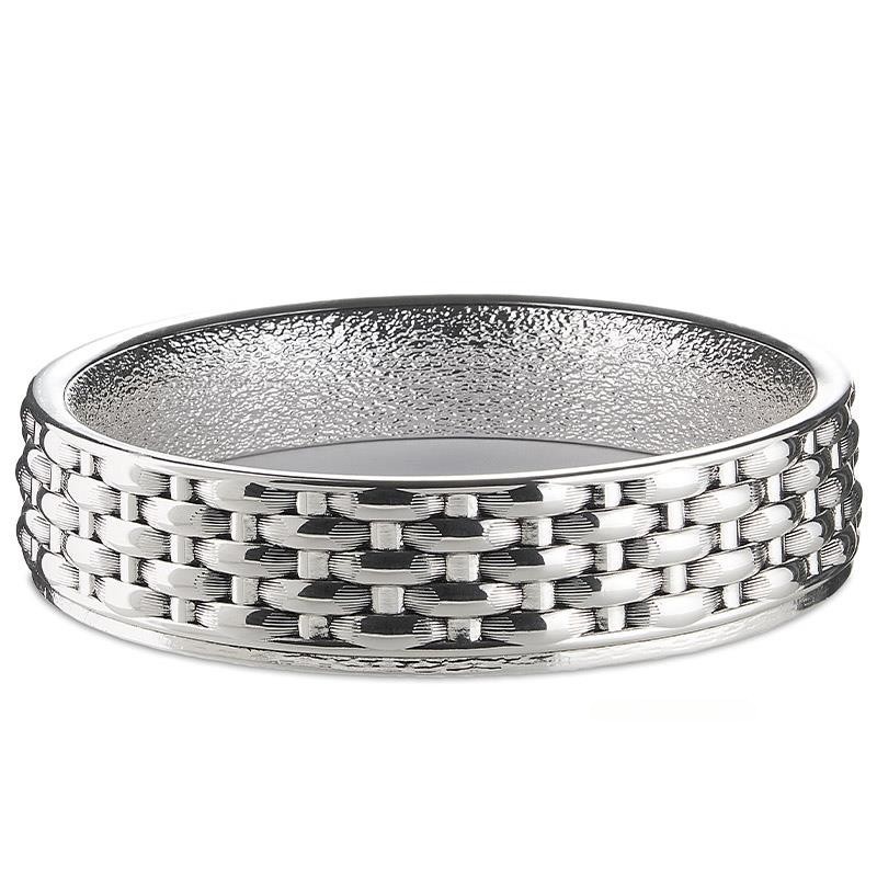 Vuotatasche in resina decorata collezione vimini . Diametro 21cm. Colore argento. L'articolo verrà spedito in confezione originale VALENTI.