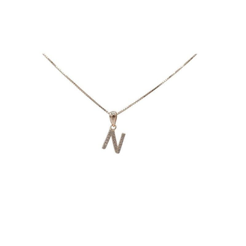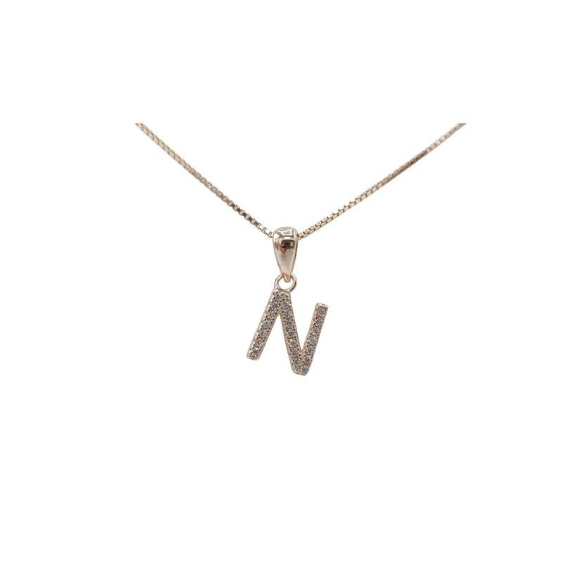 Pendente con iniziale N in argento rosato 925/°°° zirconi bianchi naturali e veneziana in argento rosato da 45 cm