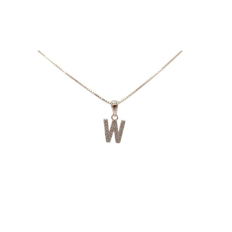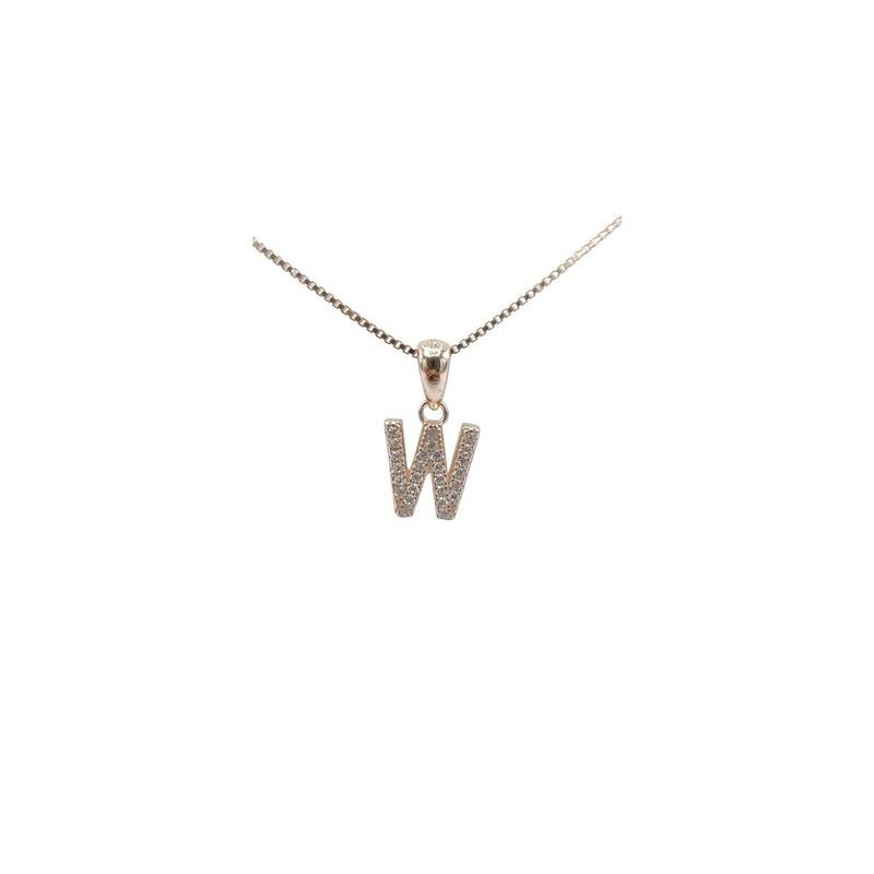 Pendente con iniziale W in argento rosato 925/°°° zirconi bianchi naturali e veneziana in argento rosato da 45 cm