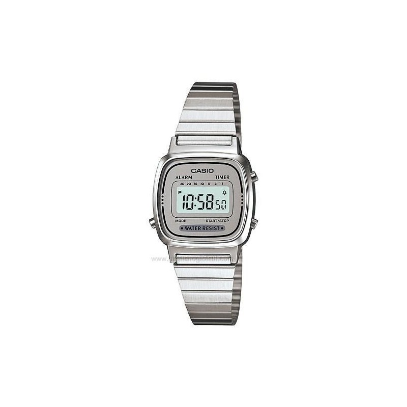 l'orologio casio la670wa-7df è tra i più intramontabili orologi casio vintage della collezione mini . movimento : quarzo funzioni principali : allarme giornaliero, calendario automatico, cronometro - 1/10 sec - 1 ora, 7 preset timer fino a 30 minuti .cassa: 30,3 mm x 24,6 mm x 7,3 mm (a x l x p)questo modello è impermeabile a norma din 8310 e/o iso 22810, sopporta quindi spruzzi leggeri. evitare un contatto con una quantità maggiore di acqua.cinturino in acciaio inoxcassa in resina quadrante con vetro acrilico di colore grigio tutti i nostri articoli sono dotati di certificato di garanzia.questo orologio verrà spedito con scatola originale casio.il classico orologio casio digitale della collezione mini è caratterizzato da una semplicità unica ma ciò nonostante rende ogni outfit decisamente alla moda. grazie alle sue multifunzioni è un prodotto da utilizzare in tutte le occasioni , dalle circostanze più sportive a quelle più eleganti e raffinate.tutti i modelli casio inoltre hanno il cinturino regolabile in base alle proprie esigenze ,il che lo rende ancora più versatile e vi agevolerà nella scelta del modello !