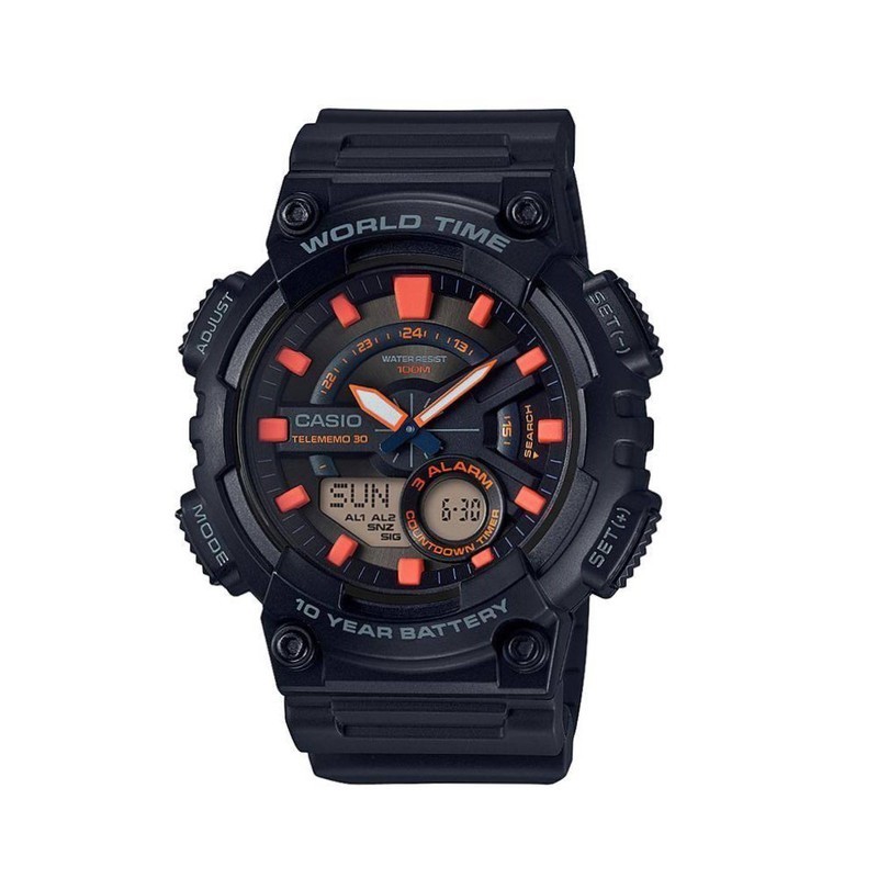 Orologio Casio in gomma. Stile sportivo, digitale e progettato per durare a lungo. Resistenza all'acqua di 100 metri, che lo rende ideale per uso quotidiano e avventure all'aria aperta. Fascia in resina nera e quadrante con dettegli blu e arancio. L'articolo verrà spedito in confezione originale CASIO.