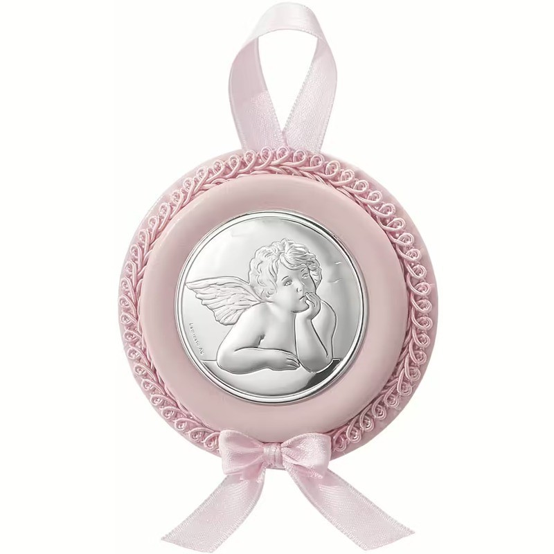 Medaglione per culla carillon Angelo Raffaello di Valenti. Medaglione di colore rosa con lastra in argento 925. Misure: d.11. L'articolo verrà spedito in confezione originale.