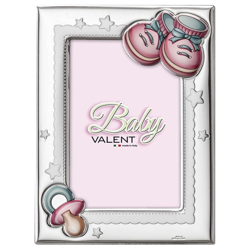 Portafoto bimba della linea Valenti & Co con scarpette rosa in argento laminato 925/°°°. Dimensione interno foto 09x13. Retro in legno bianco. L'articolo verrà spedito con scatola originale Valenti Argenti