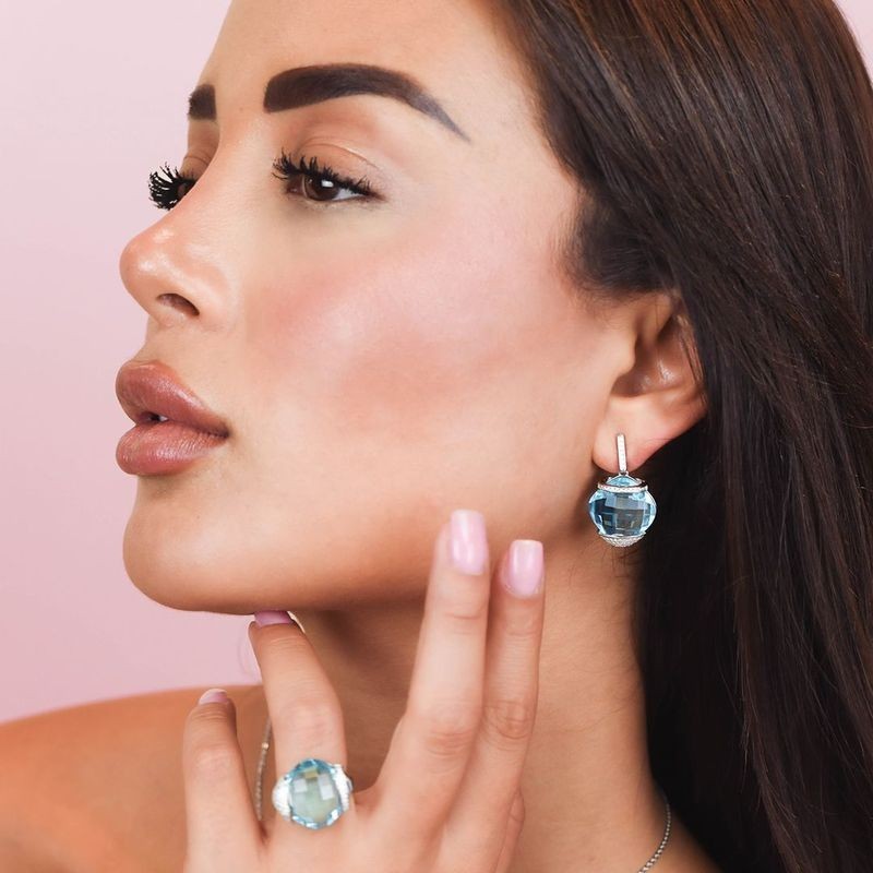 Orecchini rodiati pendenti con cristallo color acquamarina da mm 14 e pavè di zirconi naturali. L'articolo verrà spedito in confezione originale BOCCADAMO.