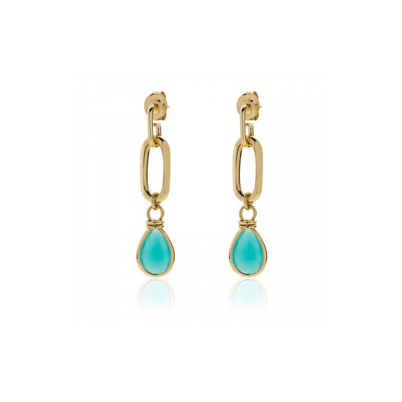 Orecchini lunghi con maglia di catena forzatina in bronzo con bagno in oro giallo 24 kt e pendente a goccia con cristallo turchese. Glamour ed eleganti, questi orecchini sono l'accessorio ideale per dare un tocco di positività ed energia ad ogni look. Abbandonati al potere magico delle pietre ed indossali insieme alla collana e al bracciale per stupire. L'articolo verrà spedito in confezione originale UNOAERRE.