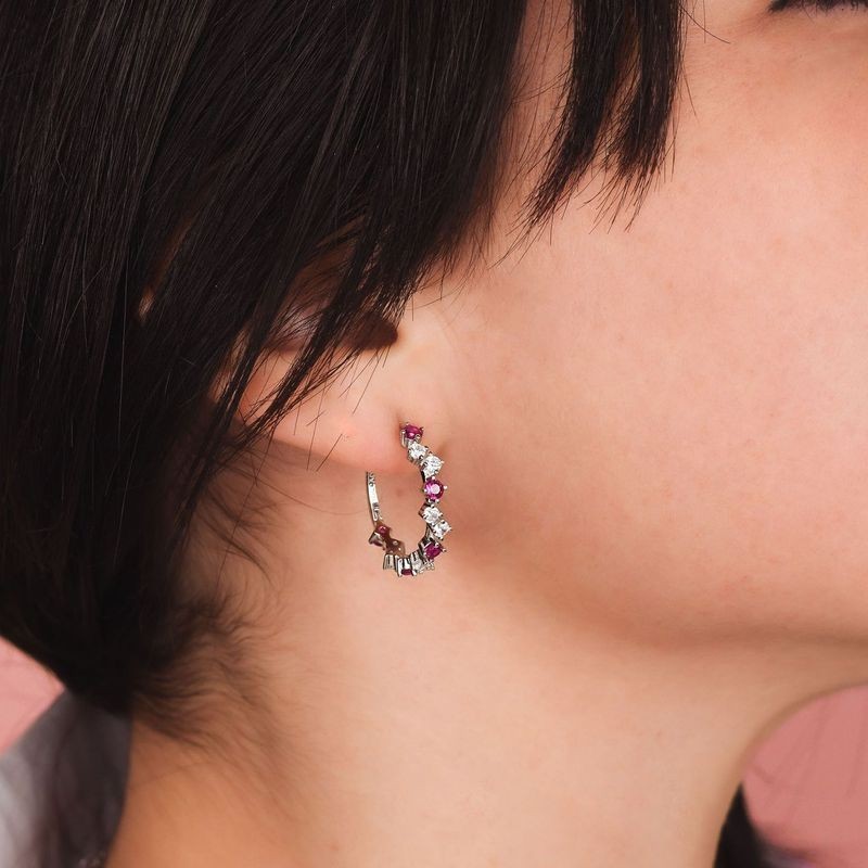 Orecchini grandi a cerchio in argento 925 rodiato, composti da zirconi naturali bianchi e color rubino. L'articolo verrà spedito in confezione originale BOCCADAMO.