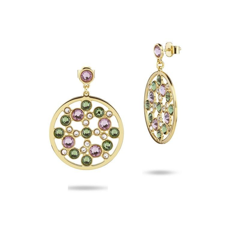 Orecchini a bottone placcati oro giallo con grande modulo circolare, cristallo, erinite verde e cristalli di ametista chiara.L'articolo verrà spedito in confezione originale.
