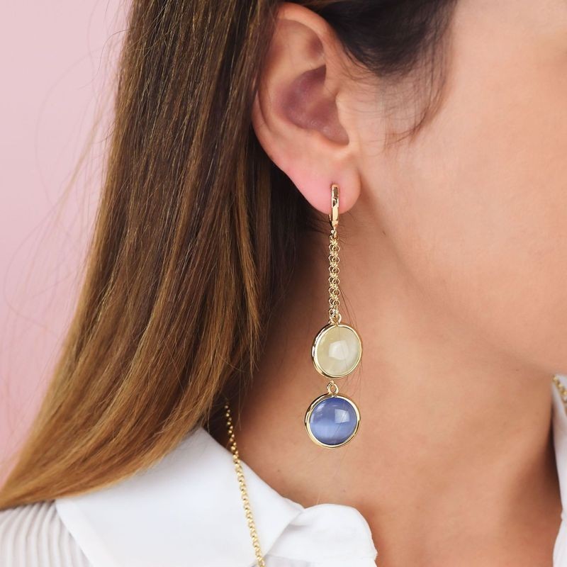 Orecchini placcati oro giallo con doppi cristalli pendenti effetto cabochon di colore madreperla e blu marino. L'articolo verrà spedito in confezione originale BOCCADAMO.