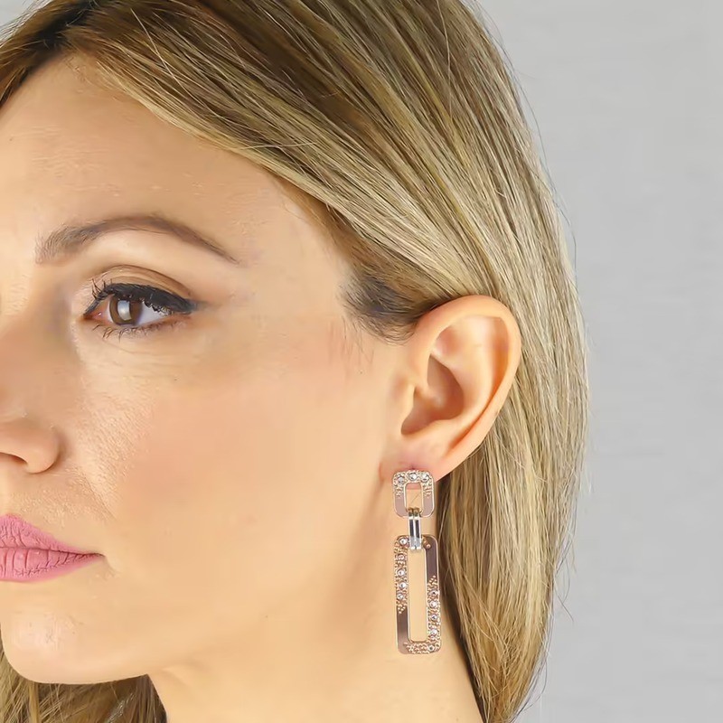 Orecchini da donna di Boccadamo della linea mediterranea della collezione magic chain. Orecchini in bronzo placcato oro rosa con pendente rettangolare dall'effetto diamantato e cristalli crystal. L'articolo verrà spedito in confezione originale BOCCADAMO.