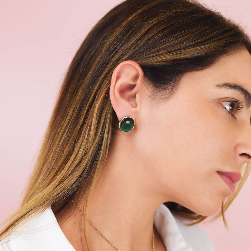 Orecchini a lobo, placcati oro giallo, con cristalli effetto cabochon di colore verde scuro. L'articolo verrà spedito in confezione originale BOCCADAMO.