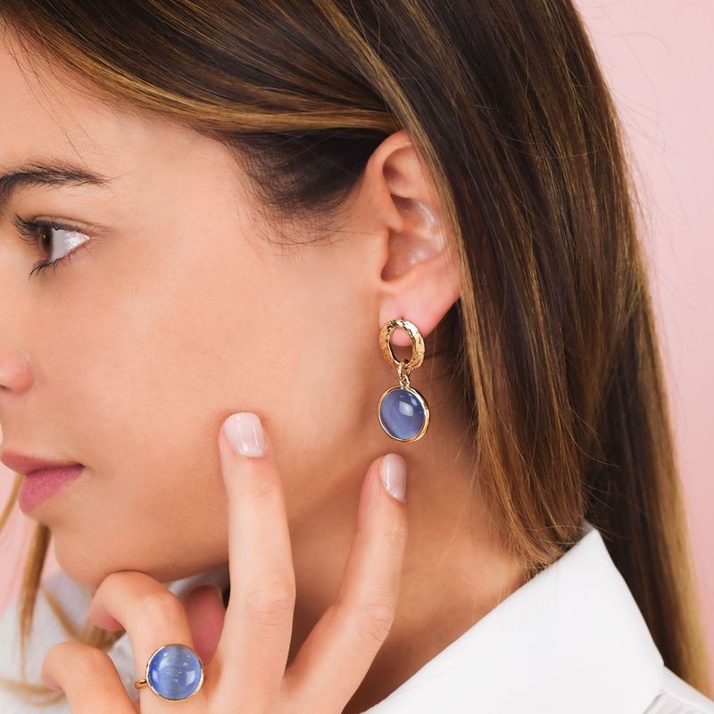 Orecchini pendenti, placcati oro, con cristalli effetto cabochon di colore blu marino e modulo circolare martellato. L'articolo verrà spedito in confezione originale BOCCADAMO.