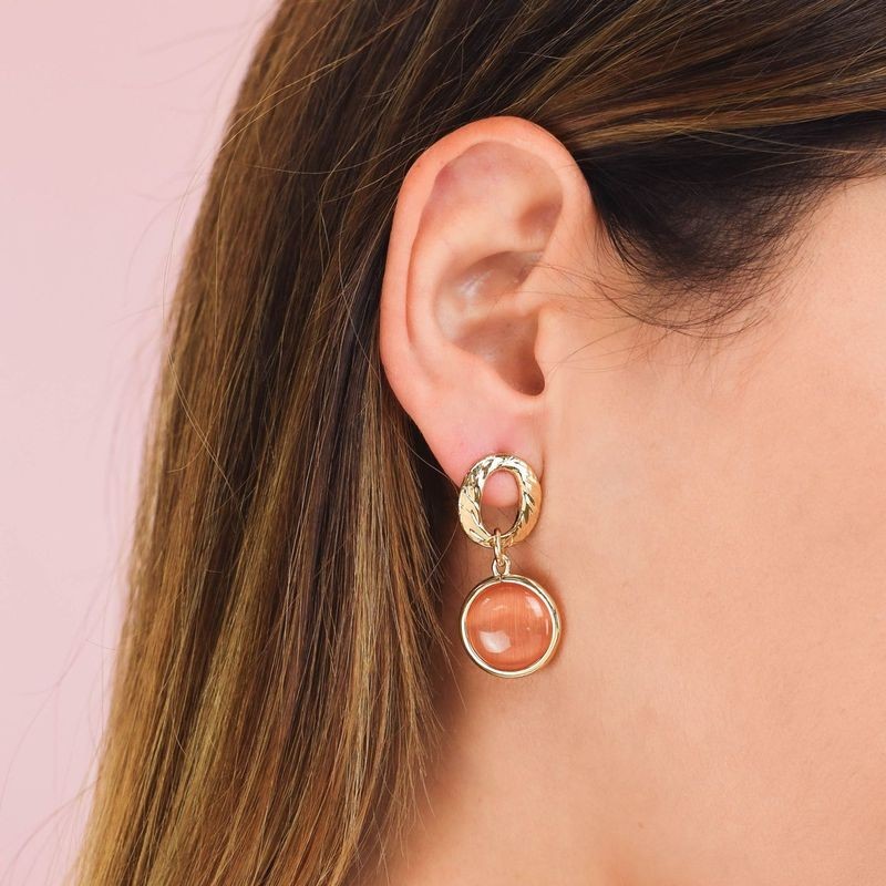 Orecchini pendenti, placcati oro, con cristalli effetto cabochon di colore arancio scuro e modulo circolare martellato. L'articolo verrà spedito in confezione originale BOCCADAMO.