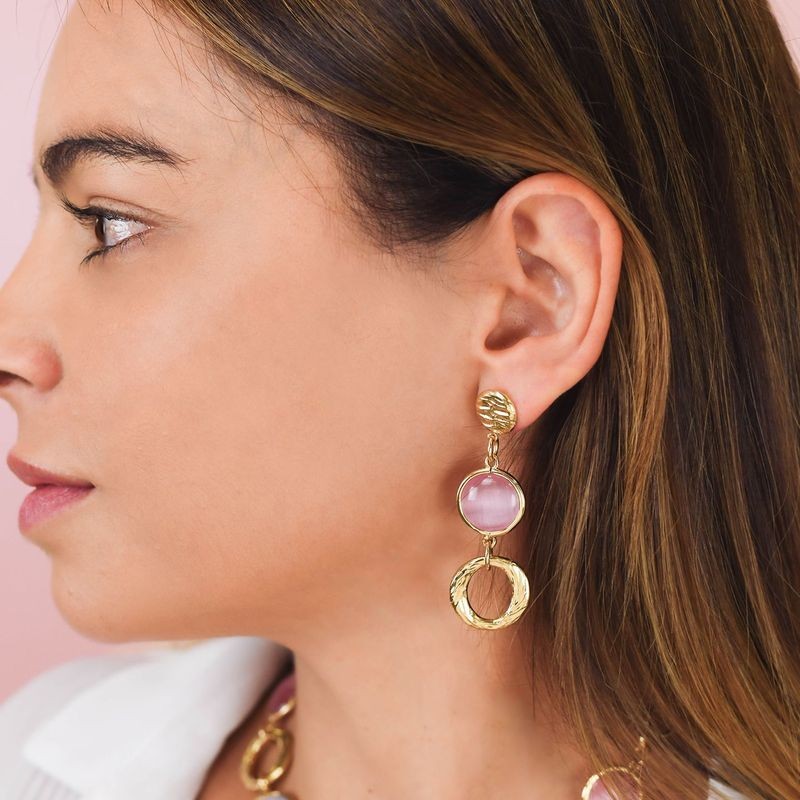 Orecchini pendenti placcati oro giallo con cristalli effetto cabochon di colore rosa chiaro tra moduli circolari martellati. L'articolo verrà spedito in confezione originale BOCCADAMO.